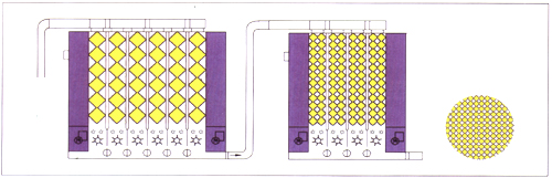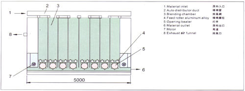 高混合數排列 由2毫混合數排列,可以得到倍數混合效果,使用4格配6格可得24倍效果。在配樣種類較多的情況下,可得到極高的混合效果。混棉箱除混棉之外,并有儲棉調節作用,以6倍為例:棉盒內儲存量為600kg,以生產線600Kg/小時生產能可延續供棉一小時,當前面設備有短暫故障時,有充分時間因應。